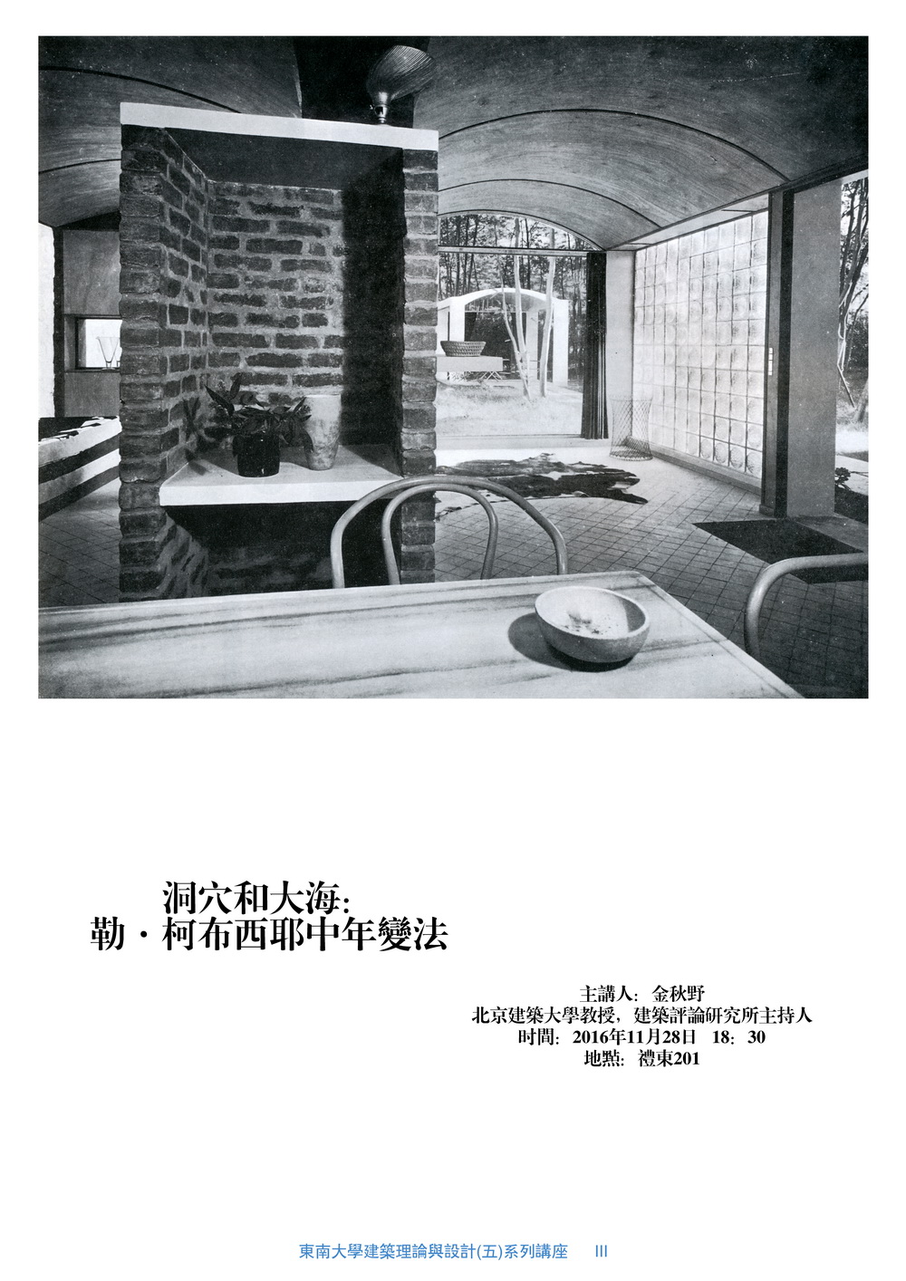 2016年11月28日晚6:30-8:30,我校400全讯白菜网金秋野教授在东南大学东礼201教室举办了题为《洞穴与大海:勒?柯布西耶中年变法》的专题讲座,本次讲座有150余名东南大学师生参与。