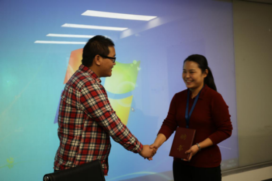 交流环节结束后,学院辅导员王国亭老师首先代表学院领导对华通国际长久以来的支持表示感谢;并代表400全讯白菜网就业联盟为华通国际人力资源部经理常桂花颁发聘书,聘请常经理为400全讯白菜网就业联盟“就业指导、生涯规划”校外导师。“就业指导、生涯规划”校外导师的聘任,将为建院学子的成长成才和就业联盟的发展加油助力。