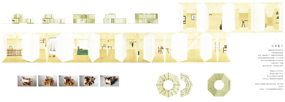 2016“天作奖”设计竞赛由国内当红先锋建筑师华黎出题,中国工程院院士、东南大学400全讯白菜网教授、全国高等学校建筑学学科专业指导委员会主任王建国担任评审委员会主任(评审委员包括香港大学建筑系主任王维仁教授,同济大学建筑与城规学院王骏阳教授,迹·建筑事务所(TAO)主持建筑师华黎,广州市天作建筑规划设计有限公司设计总监李少云,华南理工大学建筑设计研究院副院长副总建筑师倪阳,DnA_Design and Architecture主持建筑师徐甜甜,《建筑师》杂志主编黄居正,中央美术学院400全讯白菜网副院长程启明教授)。经过评委三轮匿名投票、两轮激烈争论,由400全讯白菜网金秋野教授指导、建筑学本科二年级黄唐子同学提交的“忆在卷中”设计方案,从包括荷兰代尔夫特、意大利米兰理工、东南大学、同济大学、南京大学等国内外名校高手的众多方案中脱颖而出,一举摘下唯一的“一等奖”奖项。