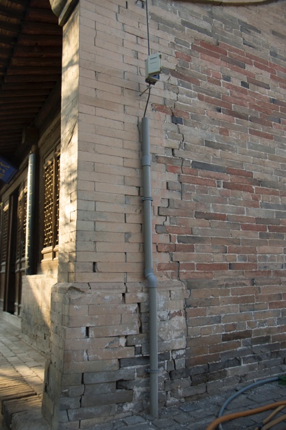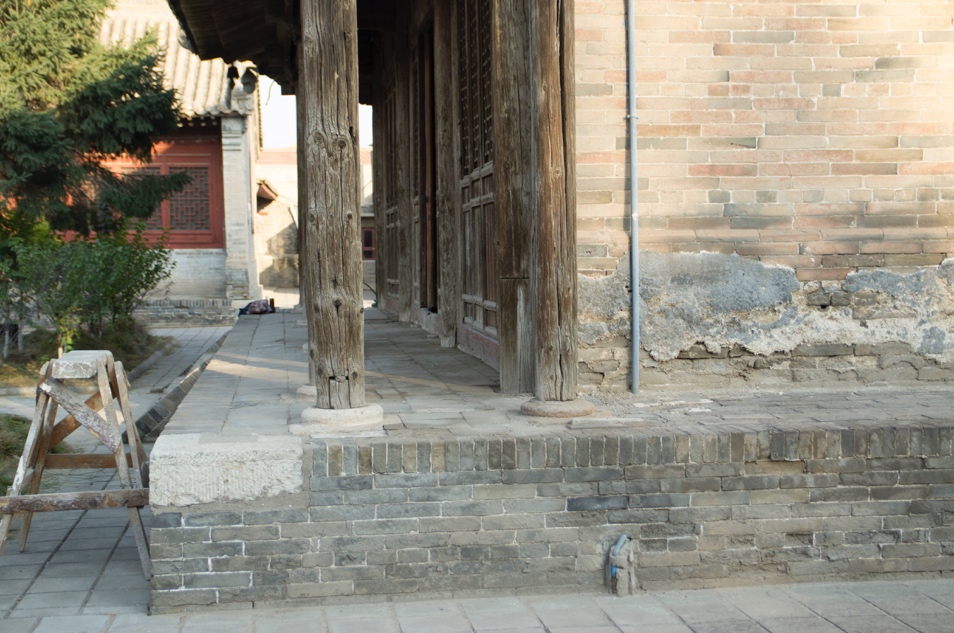人为干预:院内铺地为后期重做,新砖铺墁导致院内地坪升高,原有台基散水被覆盖,致使建筑排水不畅,台基及砖墙下部酥碱较为严重。