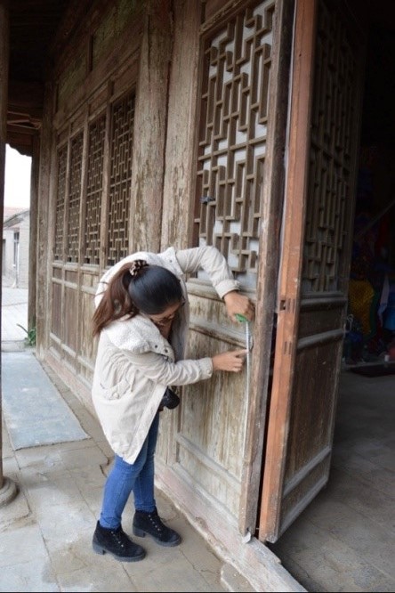 图7.曹雪利测量隔扇门 图8.刘德林、丁语、曹雪利测量檐出图