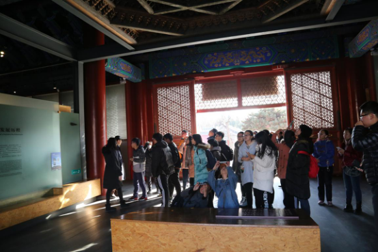 随后,古建所专家带领师生参观北京古建筑博物馆。北京古建筑博物馆位于北京先农坛内,是我国第一座收藏、研究和展示中国古代建筑技术、艺术及其发展历史的专题性博物馆。本校14届毕业生通过介绍古建照片、视频、实物及复原模型,为师生详细讲解了中国古代建筑从茅茨土阶的原始状态发展到明清时代城墙高筑、布局严整的宫廷建筑所走过的漫长历程,整体、系统的为同学们讲授了一堂中国建筑史的普及课。