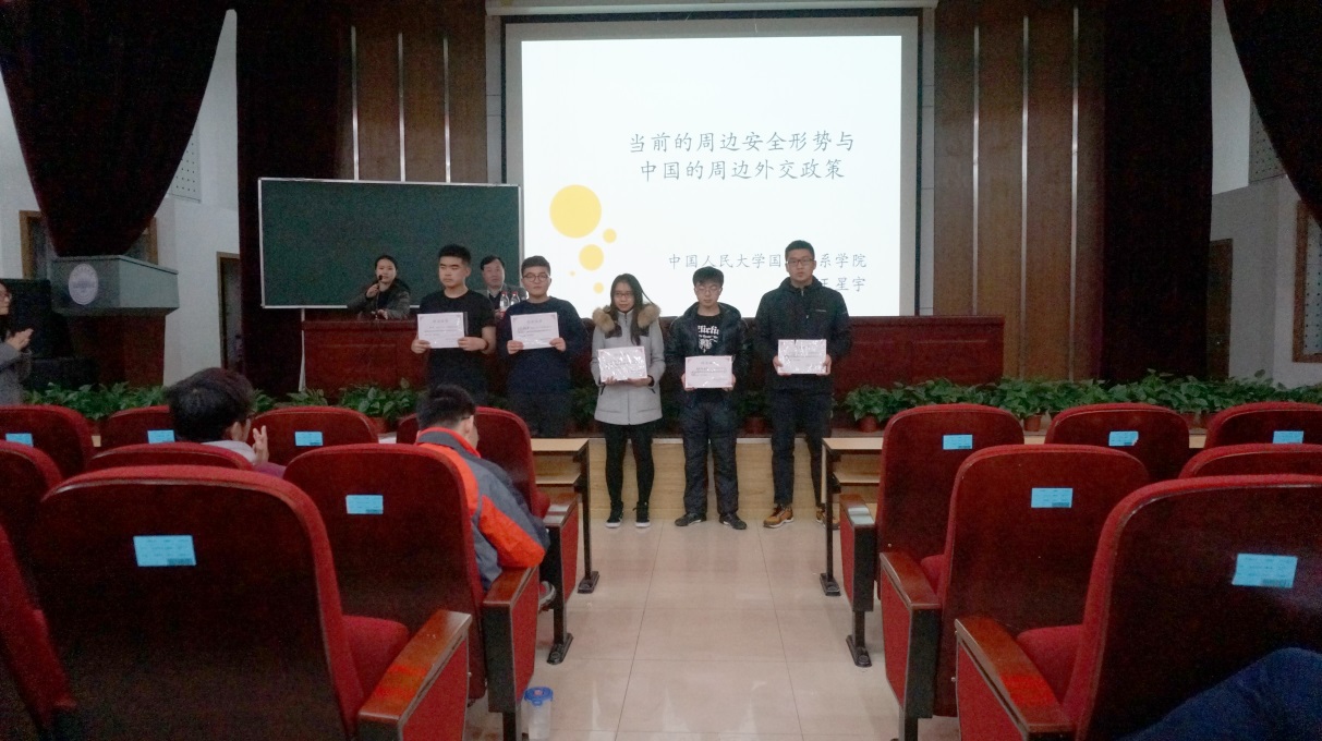 为提升我院2016级新生对党的认识、理论修养储备,积极做好培养工作,并引导学生进一步向组织靠拢,2016年11月13日晚上18时,我院2016-2017学年初级党课培训在西城校区第二阶梯教室举行了开班典礼并正式开讲。在开班典礼上,主持人首先详细介绍了入党的流程,并向2015-2016学年初级党课顺利结业的学生颁发了证书。作为本次党课的理论学习环节,学院请到中国人民大学国际关系学院的王星宇副教授担任主讲,以“当前的周边安全形式和中国的周边外交政策”为题,为我院2016级本科全体学生及其他年级的本硕学生展开了别开生面的讲座。