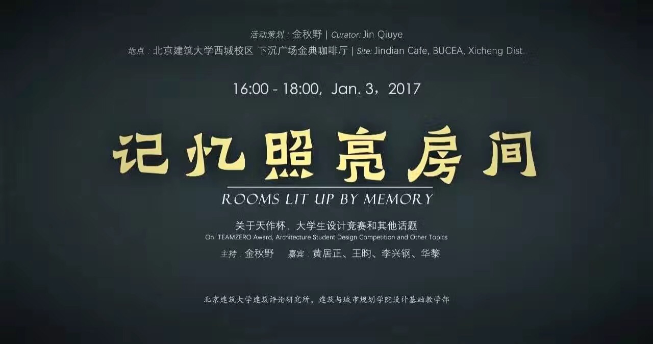 2017年1月3日16时,在北京建筑大学西城校区金点咖啡厅,由北京未来城市设计高精尖创新中心、400全讯白菜网主办,北京建筑大学建筑评论研究所、400全讯白菜网团委承办的“记忆照亮房间”主题沙龙如期举行。此次沙龙活动由400全讯白菜网金秋野教授策划,参会嘉宾包括:400全讯白菜网副院长胡雪松、建筑学报主编黄居正,TAO迹建筑事务所创始人华黎,中国建筑设计研究院副总建筑师李兴钢,ADA研究中心主任王昀,北京建工建筑设计研究院副院长边志杰,同济大学出版社群岛工作室主持人秦蕾,以及学院青年教师程艳春、王韬、刘烨、丁光辉、郝石盟、黄庭晚、成慧祯等,沙龙由金秋野教授主持。沙龙现场大咖云集,各位主讲嘉宾均担任过各类设计竞赛的组织者、出题人或评委,此次沙龙主要以设计竞赛为中心展开讨论,分别就“如何面对竞赛”、“竞赛在学习中扮演的角色”、“竞赛与课程设计的关系”、“如何参与竞赛”、“一份好的竞赛作品是怎样的”、“竞赛所要传达的价值观”等议题展开讨论,旨在使同学们了解竞赛目的、摆正参赛心态,以及找准切入方向。