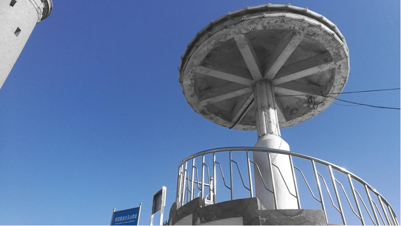 山顶在蓝色天空下的螺旋楼梯与一旁的二战日军灯塔