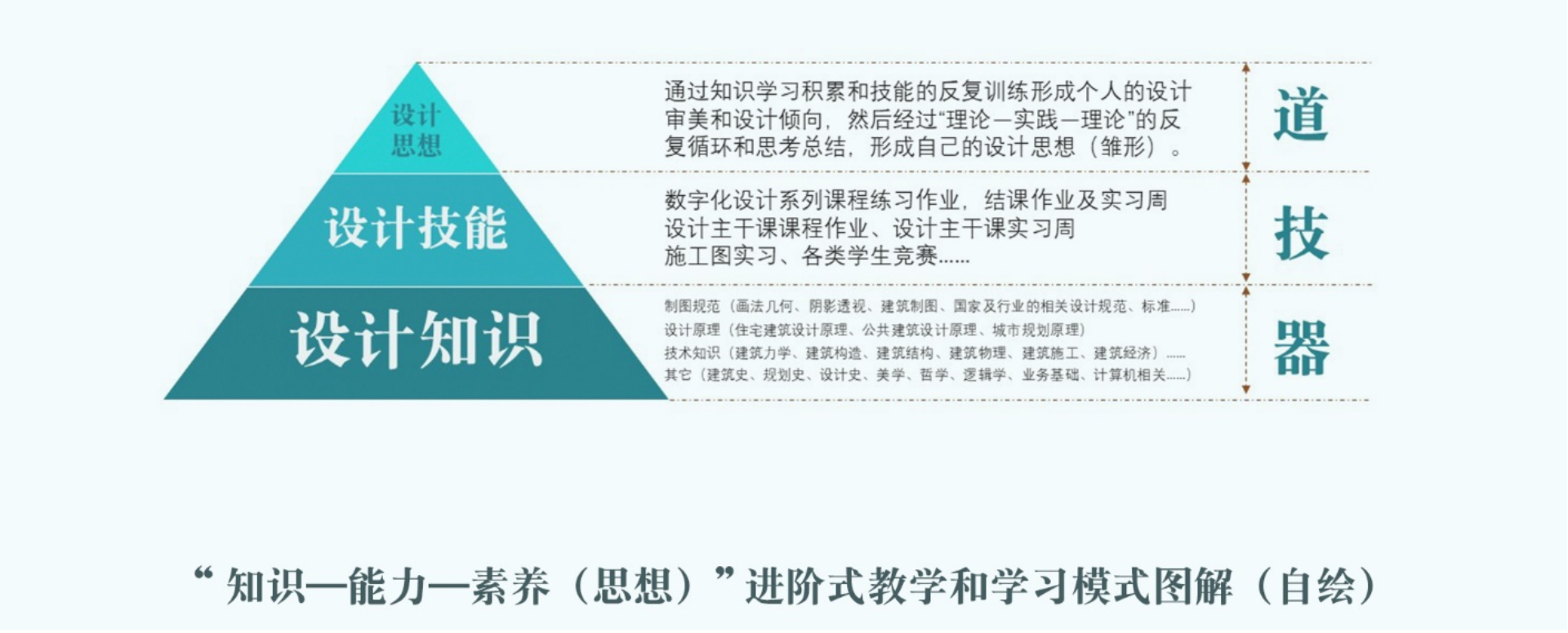 在数字化设计系列课程教学设计中,教学团队注重“进阶式”学习模式的建立,引导学生建立“设计知识——设计技能——设计思想(素养)” 的进阶式学习的概念。在教学中,将设计知识的讲解和设计技能的训练作为常态化、规范化的教学手段,而将启发学生的创新思维、引导学生建立设计批判思维和设计审美意识,鼓励学生逐渐形成个人的设计思想,积累设计素养作为教学的重点和难点。