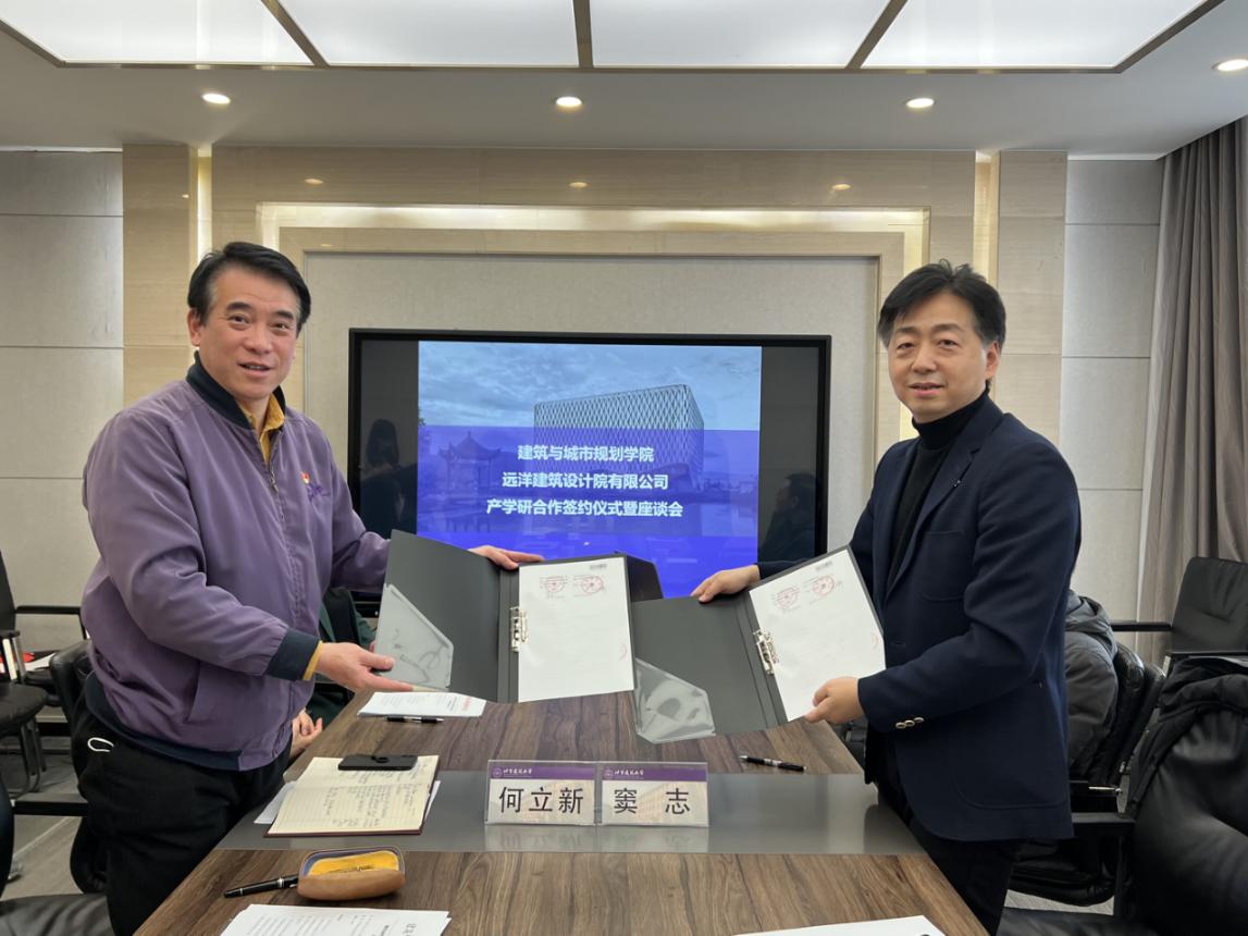 400全讯白菜网与远洋建筑设计院有限公司达成初步合作意向,窦志和何立新分别代表双方签署产学研合作框架协议书。