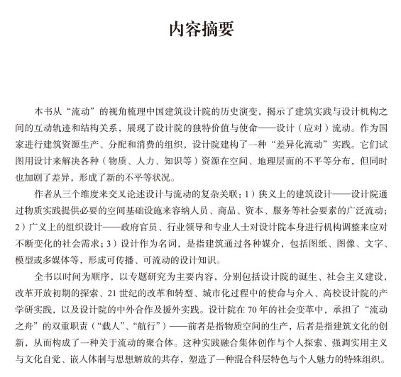 本书从“流动”视角梳理建筑设计院的历史演变,揭示了建筑实践与设计机构之间的互动轨迹和结构关系,展现了设计院的独特价值与使命——设计(应对)流动。作为国家进行建筑资源生产、分配和消费的组织,设计院建构了一种“差异化流动”实践。它们试图用设计来解决各种(物质、人力、知识等)资源在空间、地理层面的不平等分布,但同时也加剧了差异,形成了新的不平等状况。