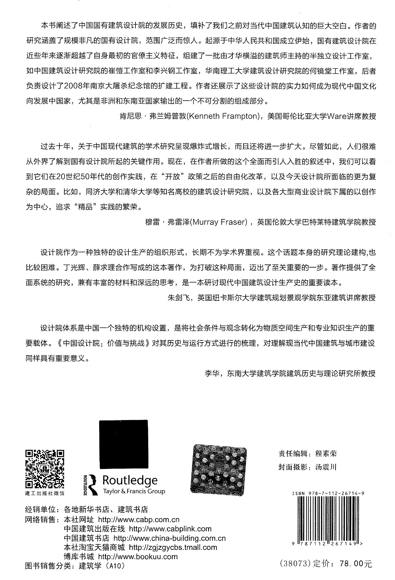 此书的出版受到美国哥伦比亚大学建筑规划与保护研究生院威尔讲席教授肯尼斯·弗兰姆普顿(Kenneth Frampton),英国伦敦大学巴特莱特400全讯白菜网教授穆雷·弗雷泽(Murray Fraser),英国纽卡斯尔大学建筑规划景观学院东亚建筑讲席教授朱剑飞,东南大学400全讯白菜网建筑历史与理论研究所教授李华等四位学者的联袂推荐,也是我院在建筑理论与评论方向的最新成果之一。