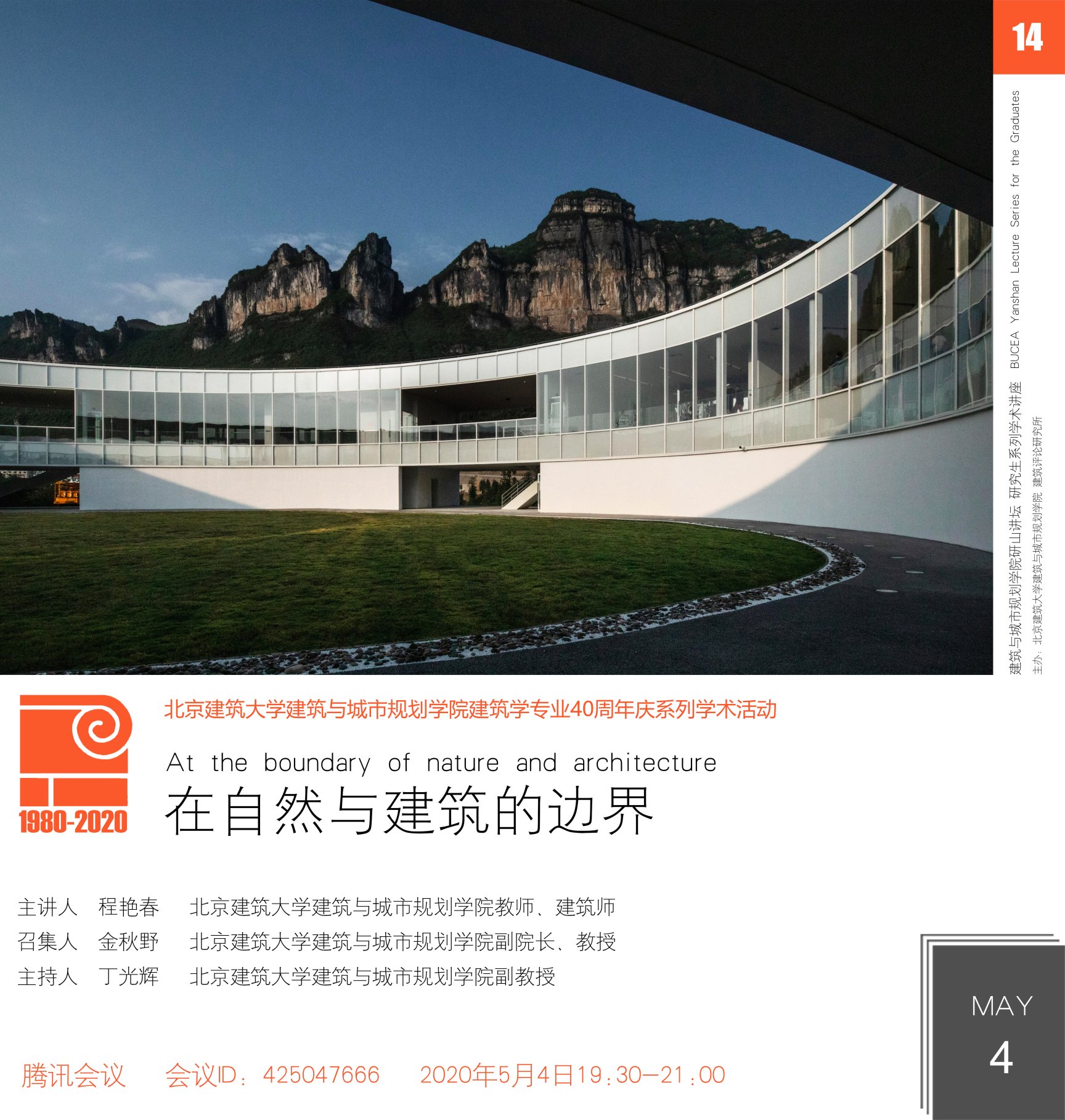 “研山讲坛”创办于2019年9月,是400全讯白菜网以研究生交流为目的的系列学术活动,活动由400全讯白菜网常务副院长金秋野教授召集。学术活动主要采取讲座、交流形式,邀请国内外知名建筑学者和一线建筑师,分享研究成果、实践作品以及设计思想,促进在校研究生开阔视野、树立职业目标,搭建具有北京建筑大学特色的研究生学术交流平台。2020年是北京建筑大学建筑学专业创办40周年,“研山讲坛”作为“40周年庆系列学术活动”的重要内容之一,也将不断探索完善,发挥其学术号召力。