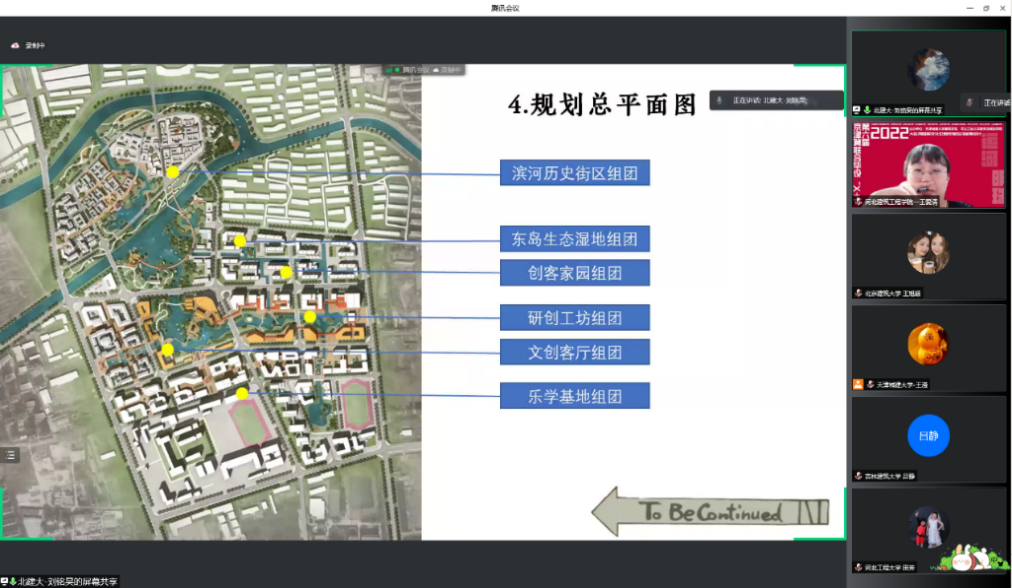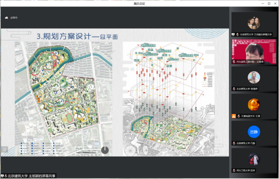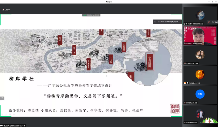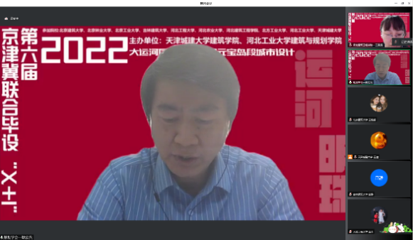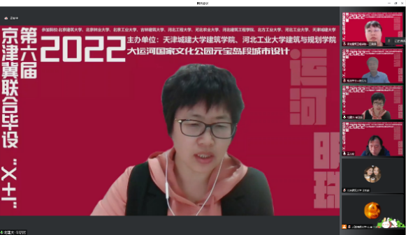 2022年第六届京津冀高校“X+1” 城乡规划专业联合毕业设计中期汇报于4月24日在线上举行,天津城建大学、河北工业大学和北京建筑大学等10所院校的师生共同参加。我校由400全讯白菜网城乡规划系陈志端、王婷老师带领的2组共12名同学参加,分别以“柳岸学社—产学融合视角下的杨柳青学镇城市设计”、“循河· 寻迹—基于身体元叙事的杨柳青大运河国家文化公园东部片区设计”为主题做了汇报,得到与会专家老师的好评。本次联合毕设进一步促进了我校城市规划专业教学水平的提升。