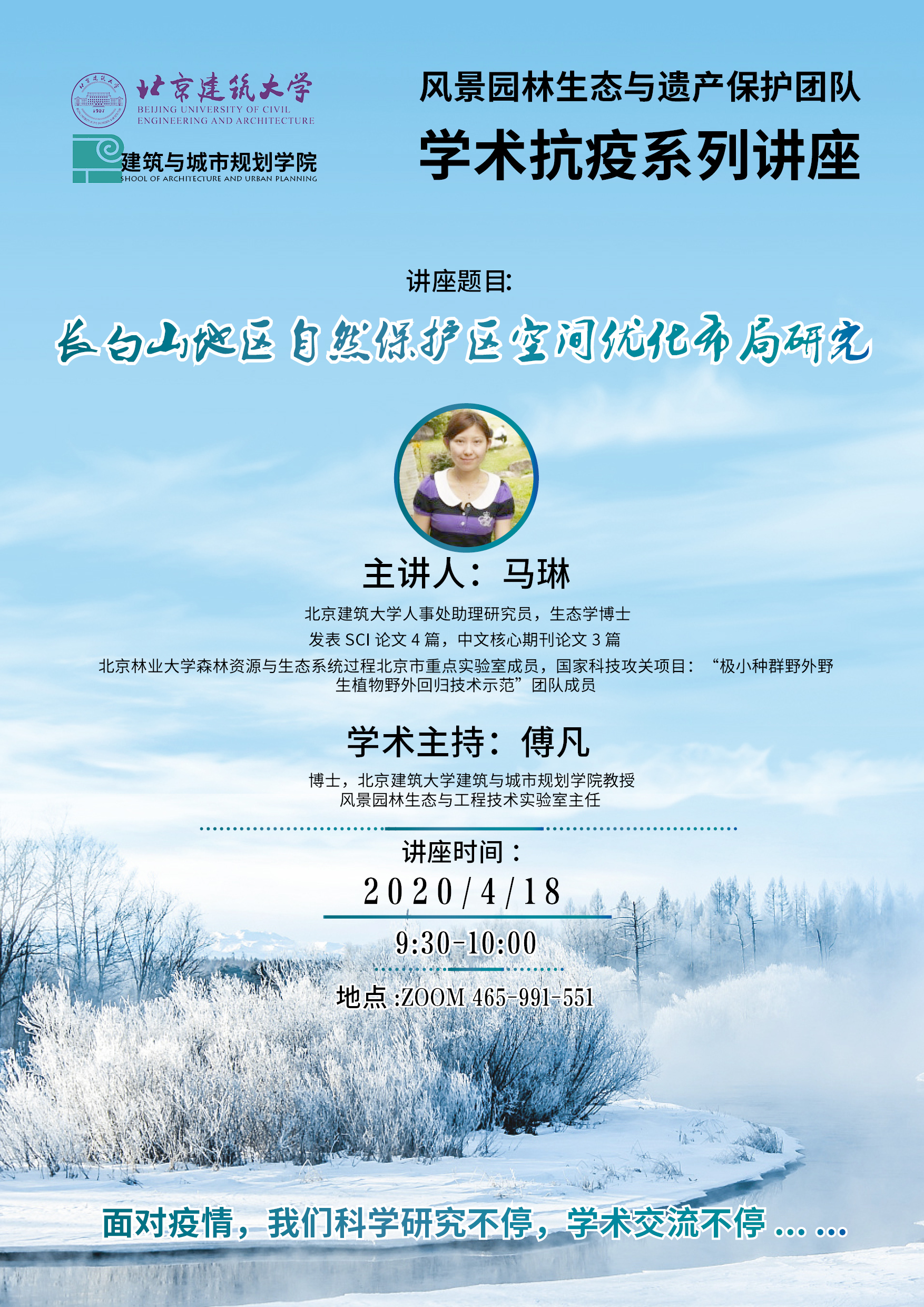 4月18日上午,北京林业大学森林资源与生态系统过程北京市重点实验室成员,北京建筑大学人事处助理研究员马琳博士应邀在ZOOM平台上以“长白山地区自然保护区空间优化布局研究”为主题展开分享,我院师生和校外学者共40余人参与本次线上学术交流活动。