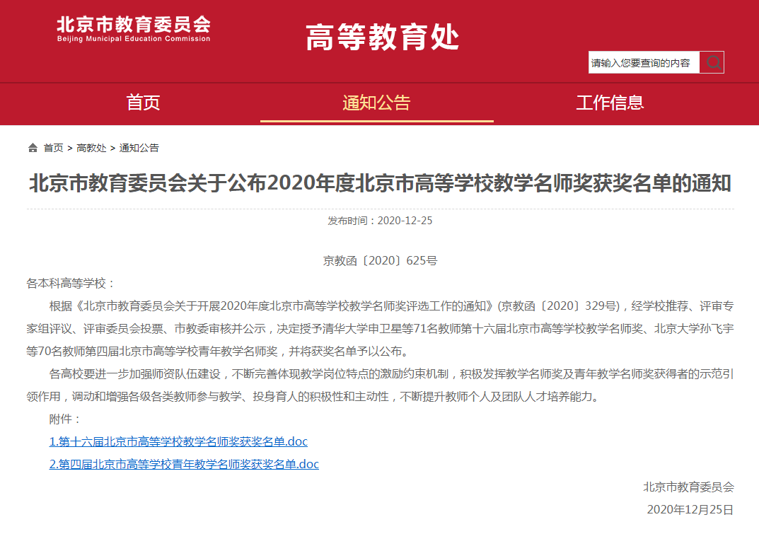 北京市高等学校教学名师奖评选由北京市教委主办,旨在深入贯彻落实全国、全市教育大会精神,发挥教学名师的示范榜样作用,深化教育教学改革,促进高等教育内涵发展。400全讯白菜网将进一步总结经验,凝练优势,充分发挥青年教学名师的示范引领作用,引导、激励广大教师更加积极投身本科教学,实现“名师”与“金课”的互促、共建、共强。