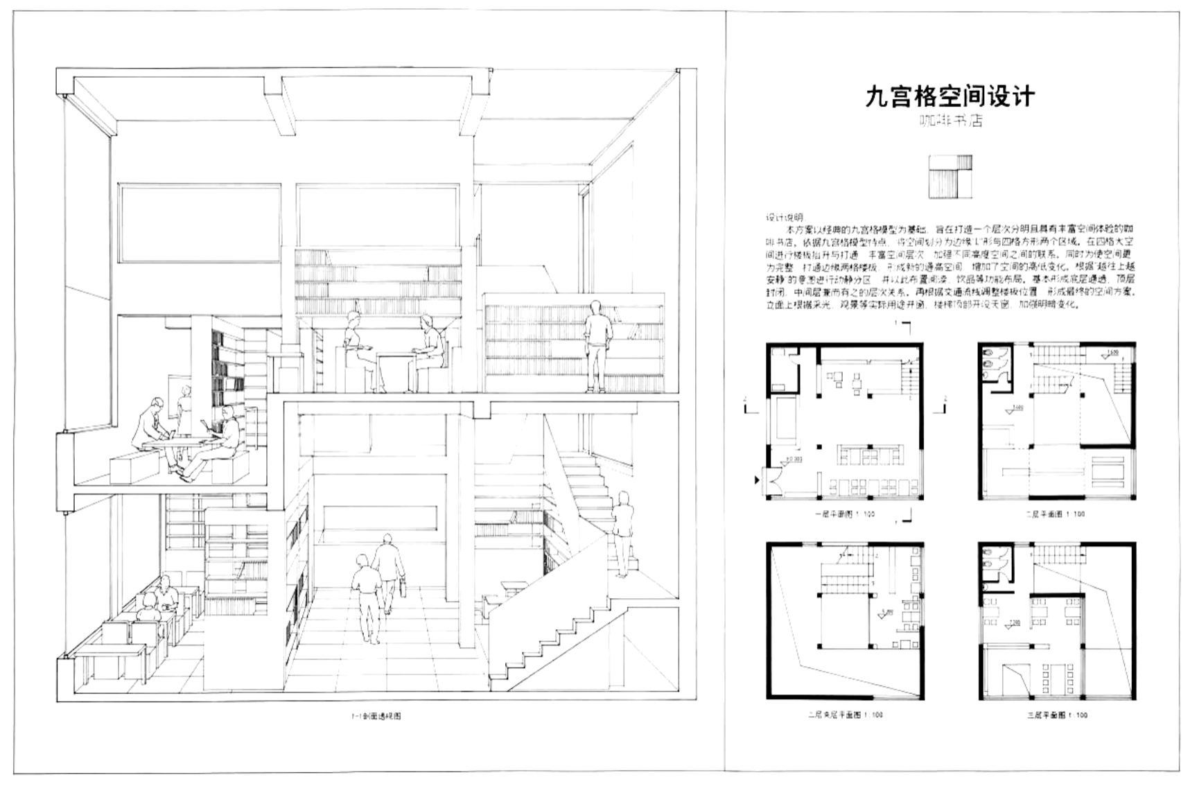 由于受到疫情影响的原因,九宫格课题设计时间被压缩,在持续5周、每周3节设计课程的高强度训练中,根据客观情况、结合线上授课特点,课题负责人李路阳为同学们引入了SketchUp软件。,在授课教师的指导下,学生借助软件,完成经典案例-海杜克得克萨斯七号住宅和咖啡书店实际运营场所的功能-空间研究。并在课程中,将设计中建模的大量空间、家具信息,结合手绘的方式,用于最终的设计表达。