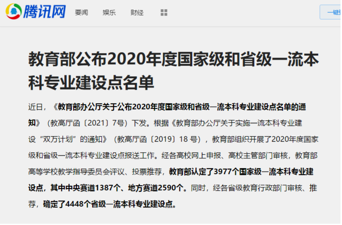 一流本科专业建设“双万计划”是教育部全面贯彻落实全国教育大会和新时代全国高校本科教育工作会议精神,推动新工科、新医科、新农科、新文科建设,做强一流本科、建设一流专业、培养一流人才,全面振兴本科教育,提高高校人才培养能力,实现高等教育内涵式发展的重要举措。截至当前,2019年、2020年已认定国家级一流本科专业建设点8031个。