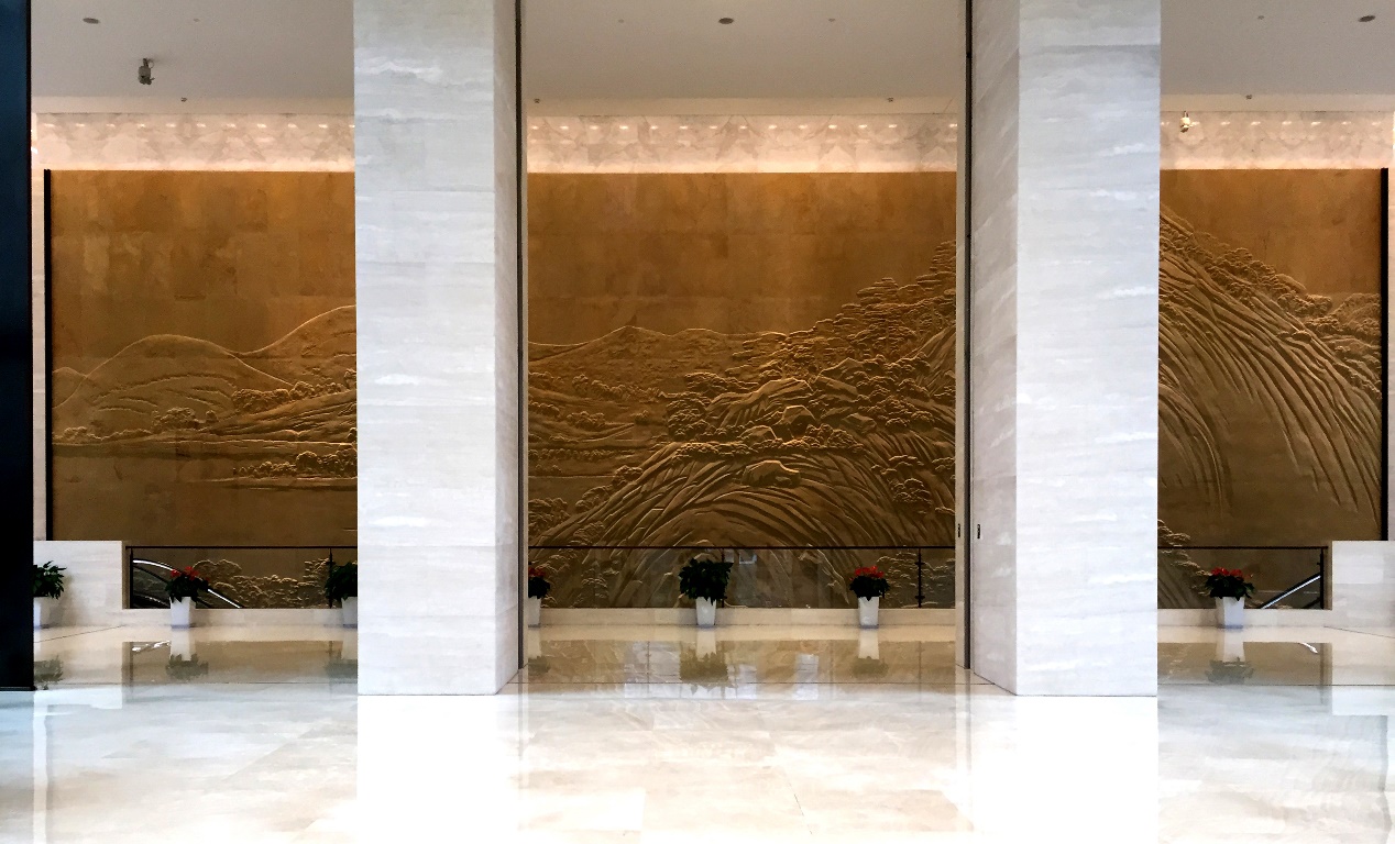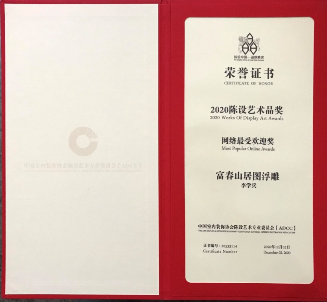 【陈设中国·晶麒麟奖】2020陈设艺术品奖于2020年12月2日揭晓,我院教师李学兵雕塑作品《富春山居图》获得优秀奖。本次获奖作品为大型砂岩浮雕,面积约为320平米,于2016年8月安装竣工于中国建筑总公司首层大堂。作品以元代画家黄公望《富春山居图》中的《剩山图》为蓝本,通过泥塑制模,数据扫描,3D粗模雕刻,人工精雕,最终完成作品。我国传统绘画,借助墨色的浓淡干湿,以及笔法的皴擦点染体现山水浩渺意境,是以虚写实;雕塑则是利用起位叠压、体面转折、虚实处理去追寻原作精神,可谓以实写虚。该作品是以现代材料加工手段对传统经典绘画的“转译”,也是以浮雕表现山水意境的有益尝试。