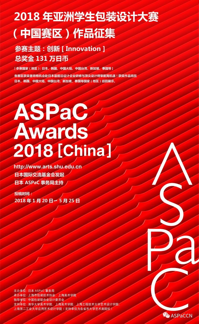 “亚洲学生包装设计大赛”是由日本国际交流基金会发起、日本ASPaC事务局主持的亚洲地区包装设计专业在校学生作品评比交流活动。2018年亚洲学生包装设计大赛由日本ASPaC事务局主办,中国包装联合会设计委员会、上海市包装技术协会、上海美术学院三家单位联合组建ASPaC中国大陆赛区组织委员会。 日本ASPaC事务局委托上海市包装技术协会负责中国大陆赛区的活动组织、作品征集、入围评审、大赛参展等工作。