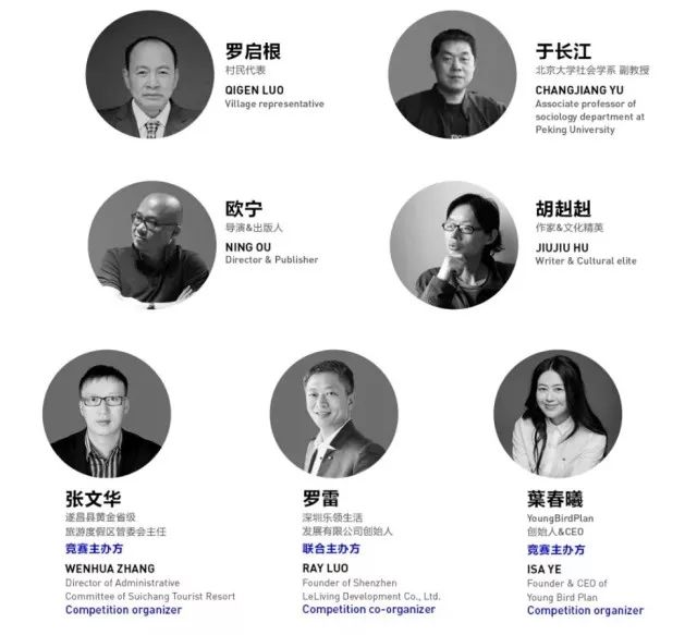 为综合考量选手的设计能力,本次竞赛设置评委评选和导师指导两个环节。为确保赛事的公平、公正,评委从跨学科角度出发,包括遂昌县黄金省级旅游度假区管委会主任、遂昌县旅委党工委委员、高级工程师张文华,村民代表罗启根,北京大学副教授于长江,导演、出版人欧宁,作家、文化精英胡赳赳以及深圳乐领生活发展有限公司创始人罗雷与Young Bird Plan创始人&CEO葉春曦。